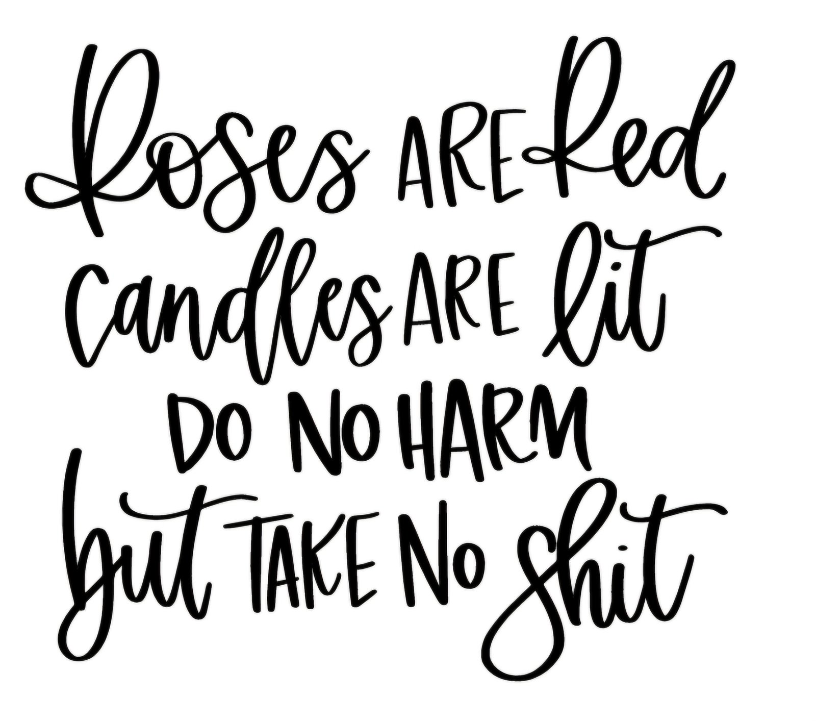 Looking for a decal that speaks volumes? The ‘Roses Are Red, Candles Are Lit, Do No Harm, But Take No Shit’ decal combines striking design and empowering words that make a bold and unforgettable statement. Perfect for expressing your individuality, this decal effortlessly adds a touch of personality to your favorite items.